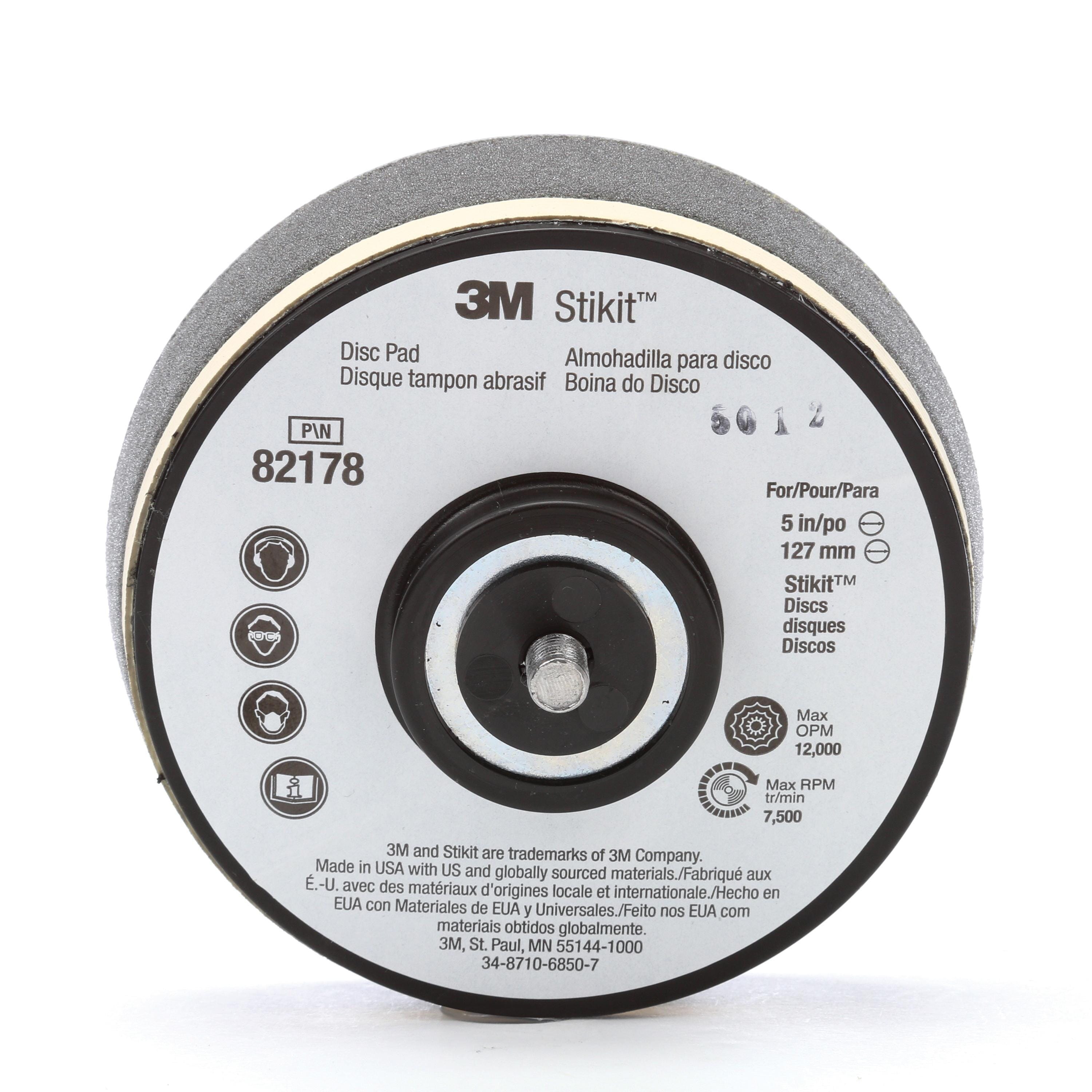 3M(TM) Stikit(TM) Disc Pad 82178, 5 in x 1-1/4 in 5/16-24 External, 10 per case. For use with 5 inch diameter Stikit(TM) discs. These vinyl face (black) pads have a soft density foam and a tapered edge for flexibility. Used for sanding contoured parts.