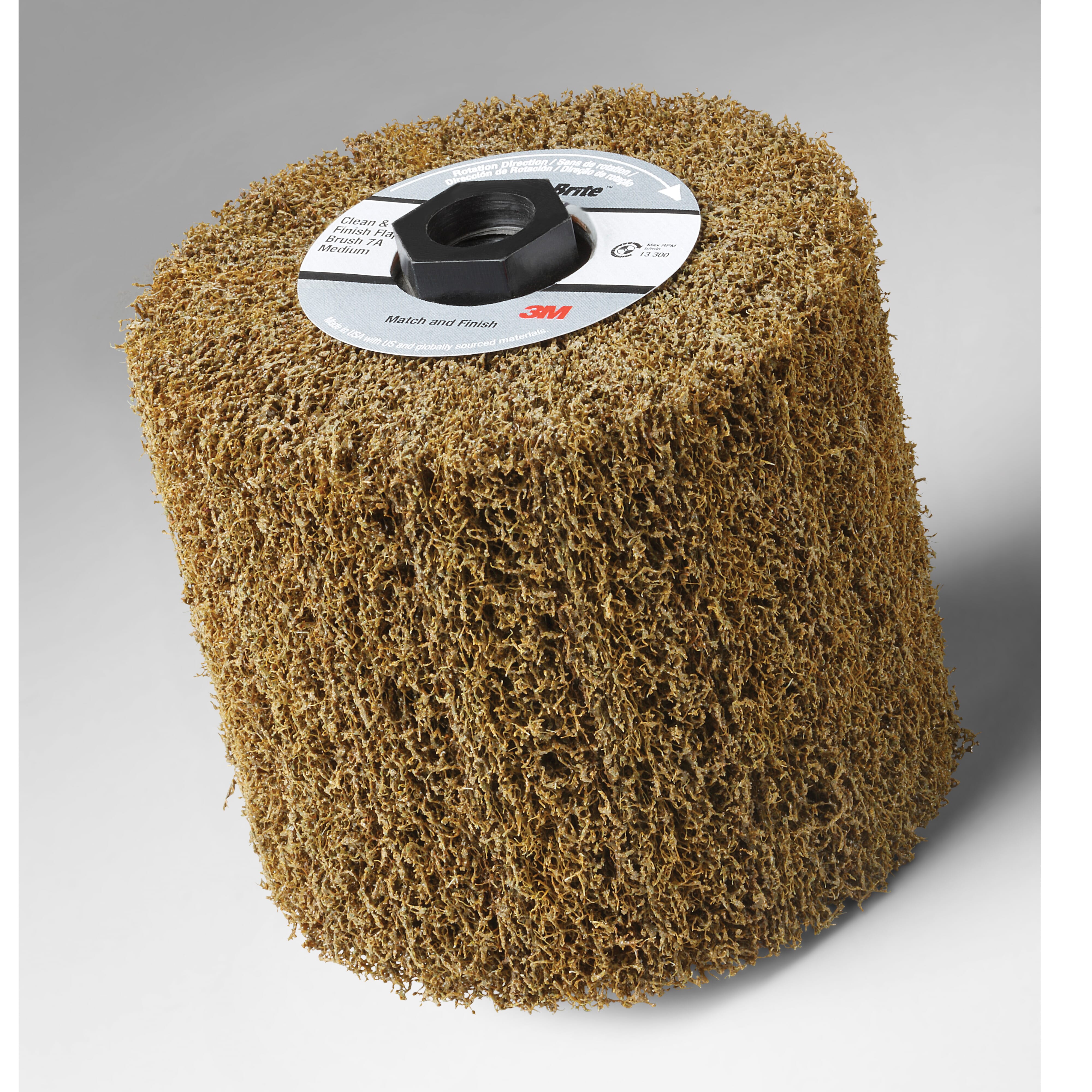 Scotch-Brite? match and finish high strength flap brush is durable and aggressive, great for blending and finishing on a variety of metals. Scotch-Brite? match and finish high strength flap brushes combine aluminum oxide mineral and our non-woven nylon fibers with resin. Sharp-cutting aluminum oxide mineral leaves a fine finish, while the spongy, open web responds to surface irregularities and maintains part geometry. This brush is one of the most durable among all the Scotch-Brite? flap brushes, so it's good for graining stainless steel, blending handling marks and imperfections, cleaning around welds and light deburring. Easy attachment Scotch-Brite? match and finish high strength flap brush may be used on the 3M? 1HP match and finish sander (sold separately) and is available in 5/8-11 threaded inserts for easy thread on/off attachment as well as a 4-way keyway attachment system. Under normal use (abiding by recommended rpm), the Scotch-Brite? match and finish high strength flap brush minimizes chatter risk. As the brush spins, flaps rotate centrifugally and make continuous contact with the workpiece. By lapping the surface, the flaps reduce the residual traces or marks that tend to be left by singular discs or discs ganged on a shaft. Welding, bending, stamping and other fabrication processes can seriously mar the mill finish of stainless steel and other metals - requiring a lot of time and many tricky, painstaking steps to restore the finish to its original condition. Scotch-Brite? flap brushes are often the last step in a Series -ushered in to a sequence when the surface is ready for a final finish. For weld blending and finish restoration, flap brushes may be preceded by other abrasives like a fiber disc for weld removal and a belt that sets the grain. With a little practice, users can feather in and out of the repair area with their flap brush, reducing chatter and marks. Some flap brushes are more durable, whereas others are more aggressive. Non-woven technology makes our Scotch-Brite? industrial abrasives unique. A combination of fiber strands, resin and abrasive mineral forms a thick, open web. The spring-like nature of the fibers responds to contours and effectively removes unwanted burrs, soils and contaminants while maintaining the geometry of the workpiece which in turn reduces rework and boosts productivity. Gaps in the web allow swarf to escape, so debris does not clog the mineral. Fibers in the web continually break down with use to reveal fresh mineral for exceptional consistency, superior cut performance and extremely long service life. Scotch-Brite? products not only enhance productivity, but also increase operator safety by reducing the need for cleaning chemicals and pastes and replacing wire brushes that can break off and cause injury. From aesthetic finishing to weld blending, deburring and more, Scotch-Brite? abrasives work fast and deliver consistent results, part after part.