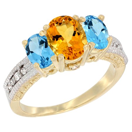 14K Yellow Gold Diamond Natural Citrine Ring Oval 3-stone with Swiss Blue Topaz, sizes 5 - 10