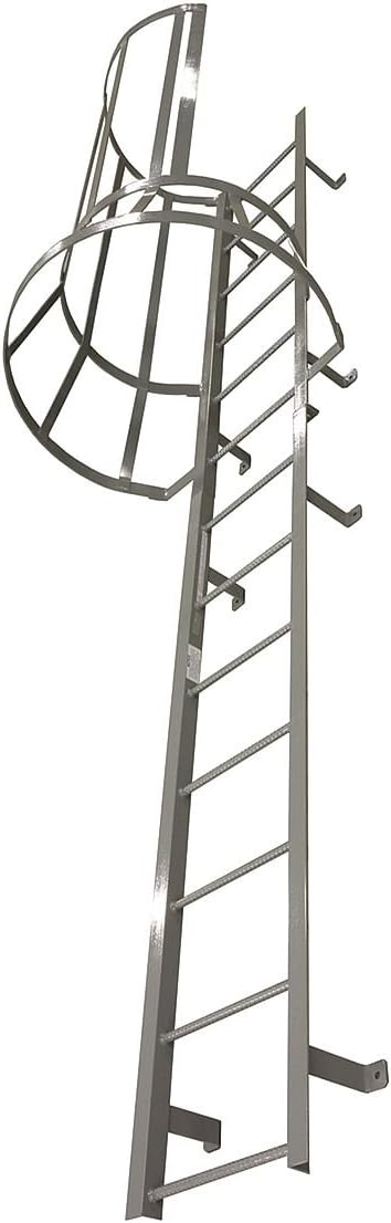 Cotterman fixed welded-steel ladder with safety cage allows solid climbing and safer landing access. Safety cage comes welded to ladder for quick-and-easy assembly. Cage with right exit extends 42 above landing surface for easier access. Side members are constructed of 2 x 2 x 1/4 angle iron with 7 standoff mounting brackets. 3/4-dia., 16W corrugated steel rungs are spaced on 12 centers. Cage begins 7 ft. from bottom of the ladder and has flared bottom opening for easy entry. Ideal for raised platforms and roofs. Meets or exceeds ANSI A14.3 and OSHA 1910.27 and 1926.1053 standards. Note: A Cal/OSHA compliant unit may be substituted for ship to addresses into the State of California. This listing is for each. Technical Specification Item - Fixed Ladders Fixed Ladder with Safety Cage Walk-Thru Included No Exit Right Overall Height 13 ft. 3 Overall Width 26 Material Steel Load Capacity 300 lb. Number of Steps 14 Top Step Height 13 ft. Rung Dia. 3/4 Rung/Step Spacing 12 Step Width 16 Finish Gray Powder Coated Standards OSHA and ANSI Green Environmental Attribute Product Contains a Minimum of 30% Post-Consumer Recycled Content Compliance and Restrictions This item is restricted for international sale. - This item has been designated by the manufacturer as an environmentally preferable product (EPP) because this item has one or more environmentally preferable attributes. For additional information, see the Tech Specs tab on the product description page.