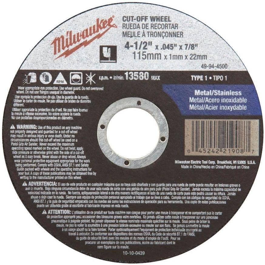 - 10 Milwaukee Premium Type 1 Metal & Stainless Steel (INOX) Cutting Wheels | 4-1/2-Inch x .045-Inch x 7/8-Inch