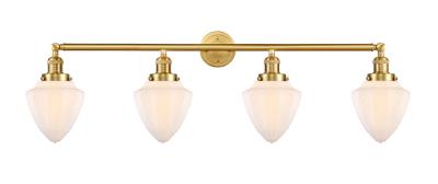 This 4 light Bath Vanity Light from the Franklin Restoration Bullet collection by Innovations Lighting will enhance your home with a perfect mix of form and function. The features include a Satin Gold finish applied by experts. Product Features Include: Brand: Innovations Lighting, Collection: Franklin Restoration Bullet, SKU: 215-SG-G661-7-LED, UPC: 729625078811, Category: Bathroom Vanity Light, Finish: Satin Gold, Glass: Matte White, Material: Steel/Cast Brass/Glass, Designer: Bruno Marashlian, Width: 45.75 in., Height: 15.00 in., Extension/Depth: 8.00 in., Backplate/Canopy Width: 4.50 in., Backplate/Canopy Length: 0.00 in., Backplate/Canopy Thickness: 0.75 in., Height from Center of Wall Opening: 2.25 in., Install Position: Reversible, Weight: 10.20 lb., Warranty: 2 Year Finish, Lifetime Electrical, Bulbs Included: Yes, Bulb Category: LED, Primary Bulb(s): 4 x 6.00 watts Medium Base ST64 Vintage, Color Temperature: 2700K, Color Rendering Index: 82.0000, Total Lumens: 600, Voltage: 120, Safety Rating: Damp Location, Title 20 Approved