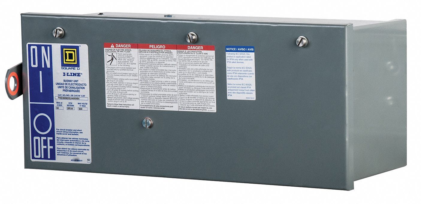 Busway Plug In Unit, Amps 100 A, Voltage 600V AC, Number of Poles 3, 3 Phase, 4 Wire, Enclosure Rating NEMA 1, For Use With Square D I-Line and I-Line II Busway, Fusible No, Breaker Type H,J, Height 8 1/2 in, Width 21 11/16 in, Depth 9 1/8 in, Standards CSA C22.2 No 27, UL Listed file E22182