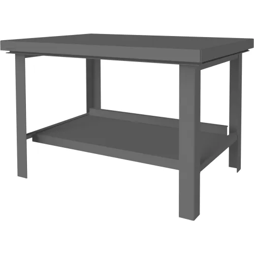 Built to withstand the toughest jobs, these extra-strong all-welded DURHAM 14,000-Lb. Capacity Workbenches will hold your heaviest industrial supplies. -1/4" steel plate top is welded to 3" C-channel frame. 3x3", -3/16" thick angle iron legs offer increased strength and rigidity. Store extra supplies on the 12-ga., 27-1/2"D lower shelf with 2-1/2" backstop. Powder coat texturized paint finish. All welded. Appropriate for lean manufacturing.