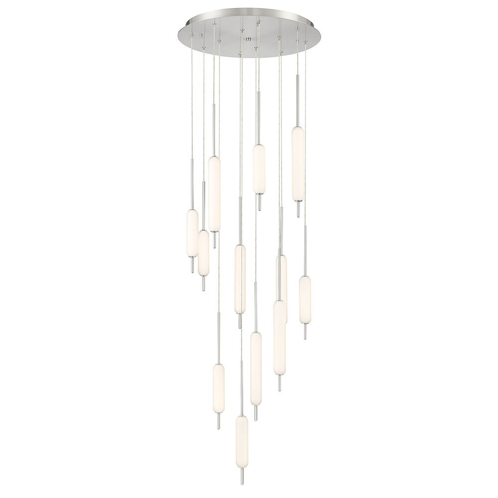 Eurofase Lighting-37235-043-Collection: Cumberland, Material: Metal, Finish Color: Satin Nickel, Width: 22", Height: 21.75", Chain Length: 96", Lamping Type: LED, Number Of Bulbs: 12, Wattage: 120 Watts, Cri: 90, Color Temperature: 3000 Kelvin, Lumens: 7200, Dimmable: Yes, Moisture Rating: Dry Rated, Desc: Cumberland 12-Light Round LED Chandelier with This contemporary design features the on-Trend opal glass finish along with various options for finishes. Product Type: Chandelier / Fixture Style: Contemporary / Shade Shape: Capsule / Hanging Support Type: Wire / Hanging Support Length: 96 inches / Cable/Wire Length: 96 inches / Chain Length: 96 inches / Slope Ceiling Compatible: Yes / Location Type: DRY Location / Bulbs Included: Yes / Lumens: 7200 / Bulb Kelvin: 3000 / Dimmable: YES / More information: 120W/LED 3000K/7200lm (dimmable) / More Information: Opal glass included / More Information: Hanging Support Type: Wire / More Information: Rated for dry locations / Canopy Backplate Height: 1.5 Inches / Canopy Backplate Diameter: 22 Inches . ,-Cumberland Round Chandelier 12 Light-Satin Nickel Finish