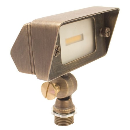 Specifications. Material - solid brass.. Finish - antique bronze BZ.. Lens - clear tempered glass, with silicon rubber gasket.. Hood - solid brass with set screw.. Mounting - 1/2 in. NPT threads, non-metallic mounting spike included.. Voltage - 12V AC.. Lamp - 20 watt MR-16 GU-5.3 bi-pin base included.. Maximum wattage - 35 watts.. Lamp Life - 2,000 hours average.. Lumens - 320 2800K.Features. Die-cast aluminum construction for long-lasting durability and corrosion resistance.. Tool free aiming and lamp replacement.. LED lamp option can reduce installed costs by reducing the size of the transformer and wire gauge size.