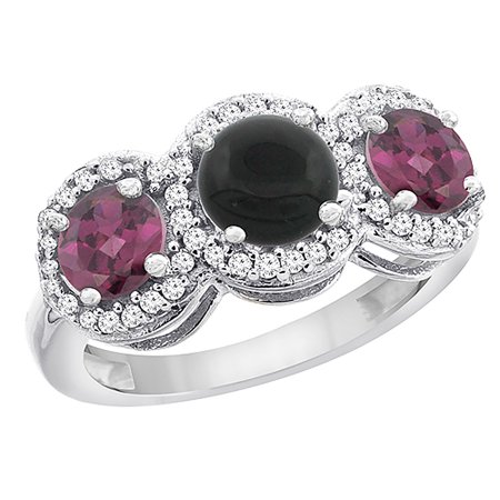 10K White Gold Natural Black Onyx & Rhodolite Sides Round 3-stone Ring Diamond Accents, sizes 5 - 10