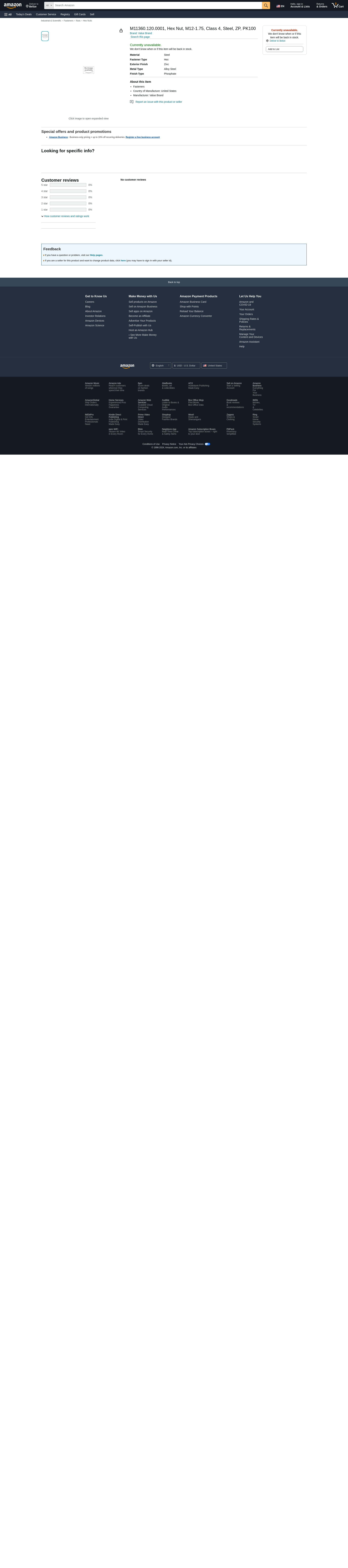 Value Brand, M11360.120.0001, Hex Nut, M12-1.75, Class 4, Steel, ZP, PK100