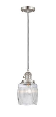 This 1 light Mini Pendant from the Franklin Restoration Colton collection by Innovations Lighting will enhance your home with a perfect mix of form and function. The features include a Brushed Satin Nickel finish applied by experts. Product Features Include: Brand: Innovations Lighting, Collection: Franklin Restoration Colton, SKU: 201CSW-SN-G302, UPC: 745684623939, Category: Mini Pendant, Finish: Brushed Satin Nickel, Glass: Thick Clear Halophane Colton, Material: Steel/Cast Brass/Glass, Designer: Bruno Marashlian, Width: 5.50 in., Height: 8.50 in., Max Height: 131.25 in., Diameter: 5.50 in., Backplate/Canopy Width: 4.50 in., Backplate/Canopy Length: 0.00 in., Backplate/Canopy Thickness: 0.75 in., Weight: 2.75 lb., Included Chain/Rods/Cord: 10 Feet Of Black Textured Cord, Switch: On/Off Turn Switch, Warranty: 2 Year Finish, Lifetime Electrical, Bulbs Included: No, Bulb Category: Incandescent, Primary Bulb(s): 1 x 60.00 watts Medium Base ST64 Vintage, Color Temperature: 2200K, Color Rendering Index: 99.9000, Total Lumens: 220, Voltage: 120, Safety Rating: UL/ETL Damp