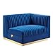 Glamour radiates from the organic linear design of the Sanguine Channel Tufted Performance Velvet Modular Sectional Sofa Right-Arm Chair. Relax and follow the vertical channel tufting for a streamlined look that adds retro modern glamour to your living room, lounge, or home office. Soft, stain-resistant performance velvet upholstery creates a luxurious tactile experience while dense foam padding and an individually wrapped spring coil system provide ultimate comfort and support for this sectional sofa piece. Solidly constructed from eucalyptus wood and plywood, this sectional sofa collection is an eye-catching addition. Sanguine's palatial accents and premium comfort rest securely on a gold stainless steel base that complements any contemporary modern home or apartment. Includes non-marking foot pads to protect flooring. Weight Capacity: 330 lbs.<br/><br/>Features :<br/><br/>- Materials: Performance velvet, stainless steel<br/>- Finish: Navy blue, gold<br/>- Vertical Channel Tufting<br/>- Spring Coil System<br/>- Dense Foam Padding.<br/><br/>Specifications :<br/><br/>- Product Dimensions : 28"H x 41"W x 36"D<br/>- Product Weight : 63 lbs<br/>- Weight Capacity : 330 lbs.