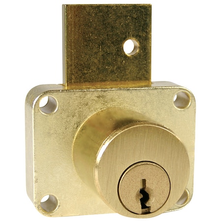 ' Pin Tumbler Cam Door Lock, Dead Bolt, Satin Brass Finish, Mounting Hole Dia. 57/64 In., Head Dia. 7/8 In., Cam Length 3/4 In., Cam Width 7/8 In., Max. Latching Distance 1/4 In., For Door Thickness 7/8 In., Unlock Turn Direction Left, Unlocking Radius 360 Deg., Number of Pins 4, ANSI/BHMA Grade 2 Standards, Key Number KD, Includes Two Keys, Strike and Mounting Hardware, Key Type Different '