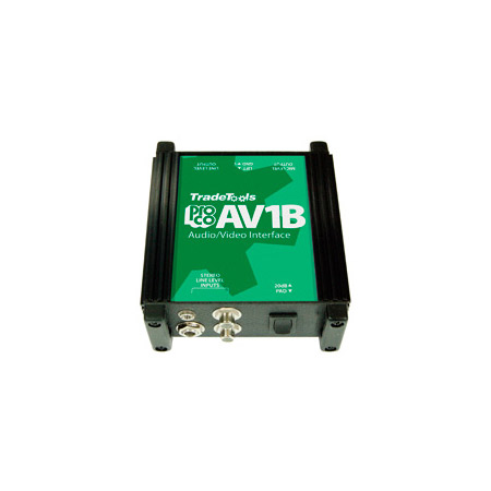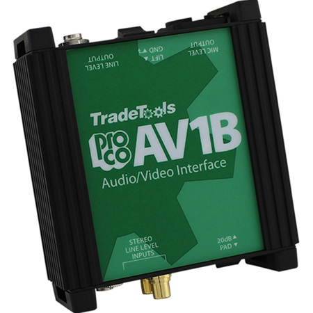 The Pro Co TradeTools AV1B Audio-Visual Interface allows the line-level outputs of audio and video playback devices, etc., to be connected to microphone inputs of house or portable P.A. systems for programs in school auditoriums, lecture halls, civic meetings and corporate board rooms. The AV1B provides audio interfacing and isolation with wide response and low distortion.</p><p>Three different types of input connectors-1/4" (6.3mm) T/R/S phone, 2 RCA-type phono, and 3.5mm T/R/S mini jacks - simplify connection of most equipment. The PAD IN/OUT attenuator switch allows greater flexibility for handling line output sources at either "hi-fi" -10 dBV or "professional" +4dBm levels. The DBT-1 transformer provides a floating 150-ohm output with a standard 3-pin male XLRtype connector, so connection to most P.A. system mixers or mixer/amplifiers requires only a standard microphone cable. The GND/LFT switch eliminates hum and buzz from AC ground loops between equipment. For further versatility of operation, there is also a 1/4" (6.3mm) unbalanced line-level output.</p><p>The AV1B's construction and components are top-grade throughout, ensuring trouble-free operation in educational, institutional and A/V rental settings. Pro Co's "Uni-box" enclosure is formed of extruded aluminum side channels and 16-gauge steel top, bottom and end plates and is designed to protect it's switches and connectors from accidental damage. The use of steel also provides excellent magnetic shielding for the transformer from EMI/RFI fields. The finish is durable black textured powder coat on the end plates and the side channels are black anodized aluminum. Easily readable control and connector identification graphics are incorporated into a durable Lexanr overlay on the top panel. The uniquely slotted side channels allow for stacking on top or strapping side-to-side of virtually any number of Pro Co TradeTools devices using the Uni-box construction.</p>