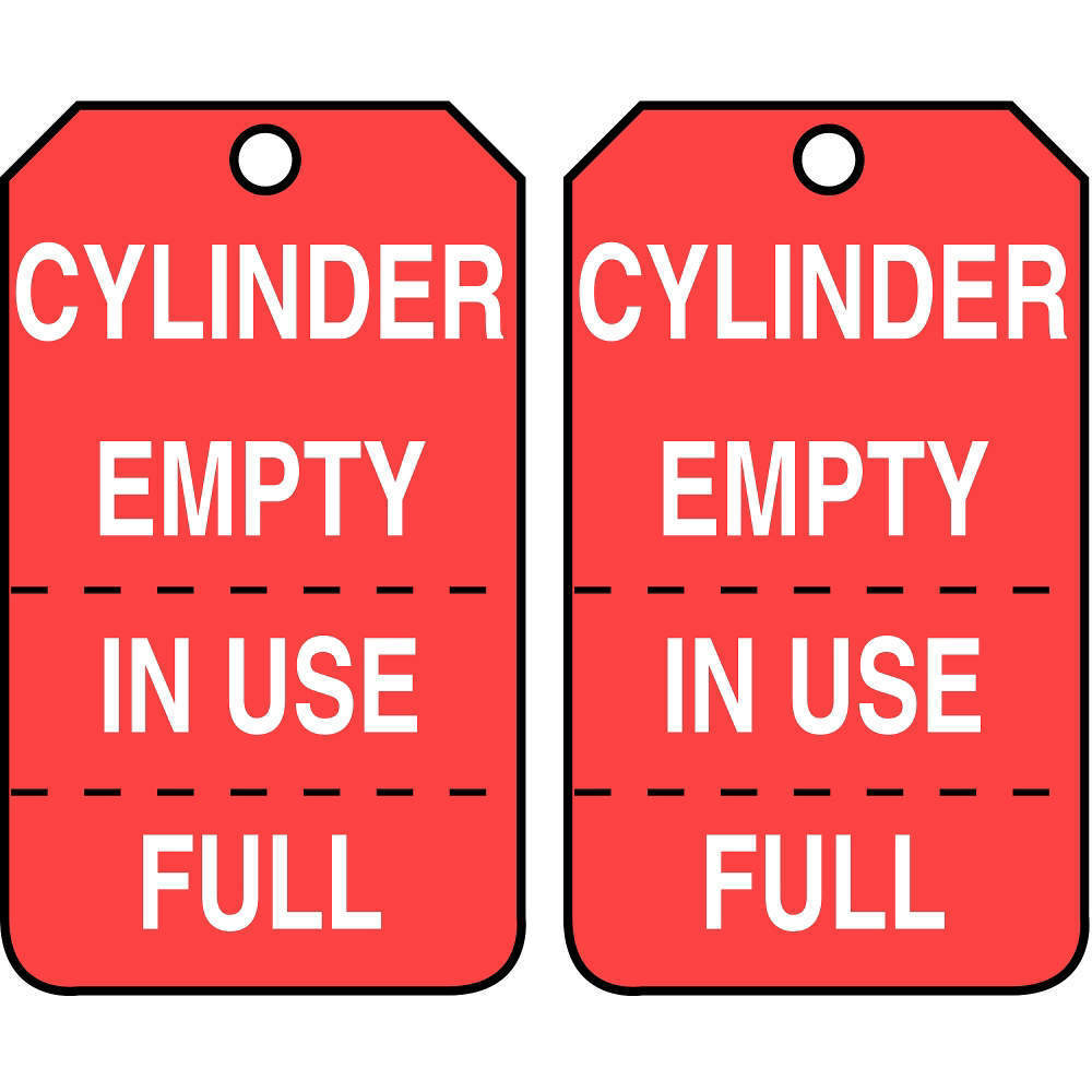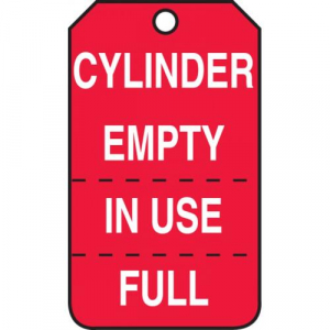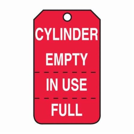 Accuform Signs 5 7/8" X 3 1/8" Red And White PF-Cardstock Perforated Cylinder Status Tag "Cylinder Empty In Use/Full". Accuform Signs PF-Cardstock Tags are tear-resistant, waterproof, pulp-free - no wood pulp or paper content. Pliable 10-mil poly-based tags will not crack, distort, or shrink. Ideal for indoor and short-term outdoor conditions. Scuff-resistant, matte surface. 3/8" hole. (Purchase of 3 Each)