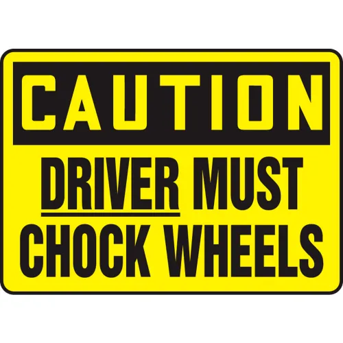 Accuform, MTKC609VS, 7" x 10" OSHA Caution Safety Sign "Driver Must Chock Wheels" Adhesive Vinyl Features: Flexible 4-mil thick vinyl with acrylic adhesive Non-glare surface printed Moisture resistant Service temperature range: -40 to 176 F