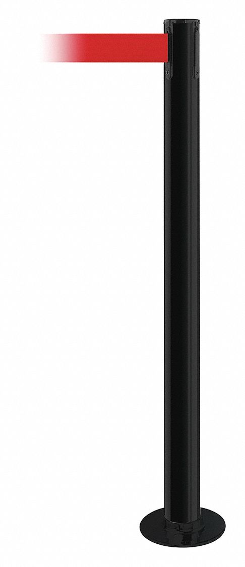 Fixed Barrier Post with Belt, Post Material Steel, Post Finish Black, Post Height 36 1/2 in, Post Dia. 2 1/2 in, Base Type Flange, Base Dia. 5 in, Base Material Steel, Base Finish Black, Number of Belts 1, Belt Length 7 1/2 ft, Belt Color Red, Belt Width 2 in, Indoor, ADA Compliance No