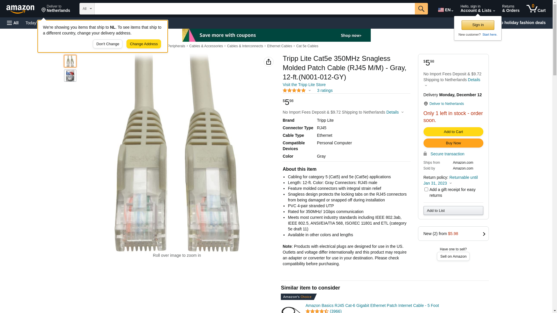 | Feature | <b>Price For:</b> Pack of 100 <b>Manufacturer</b>: Tripp Lite <b>Product Category</b>: Ethernet Cables / Networking Cables <b>RoHS</b>: <b>Type</b>: Cat 5e <b>Connector End A</b>: RJ45 <b>Connector End B</b>: RJ45 <b>Gender</b>: Male / Male <b>Length</b>: 12 ft <b>Color</b>: Gray <b>Brand</b>: Tripp Lite <b>Description/Function</b>: Snagless Molded Cable |