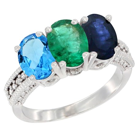 14K White Gold Natural Swiss Blue Topaz, Emerald & Blue Sapphire Ring 3-Stone 7x5 mm Oval Diamond Accent, sizes 5 - 10