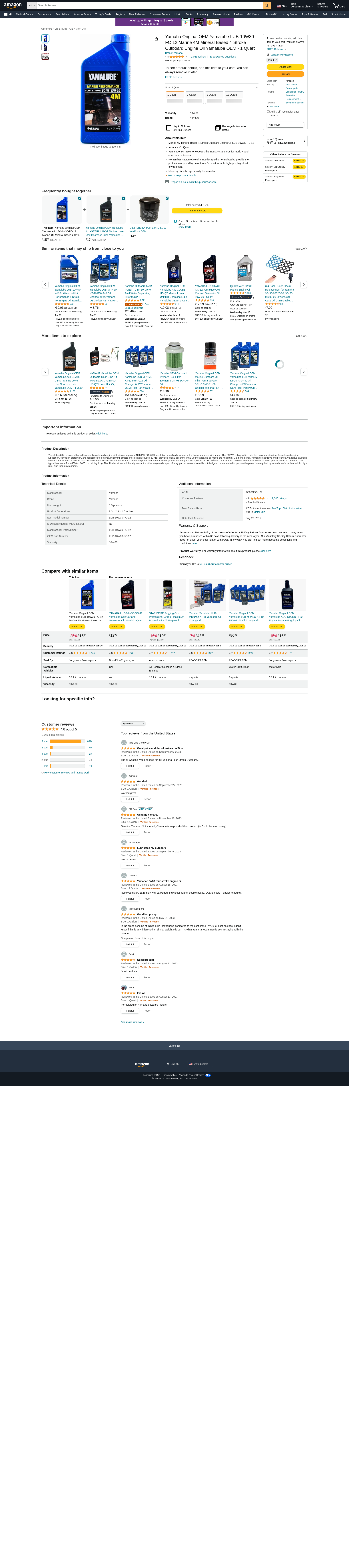 Yamaha Original OEM Yamalube LUB-10W30-FC-12 Marine 4M Mineral Based 4-Stroke Outboard Engine Oil Yamalube OEM - 1 Quart