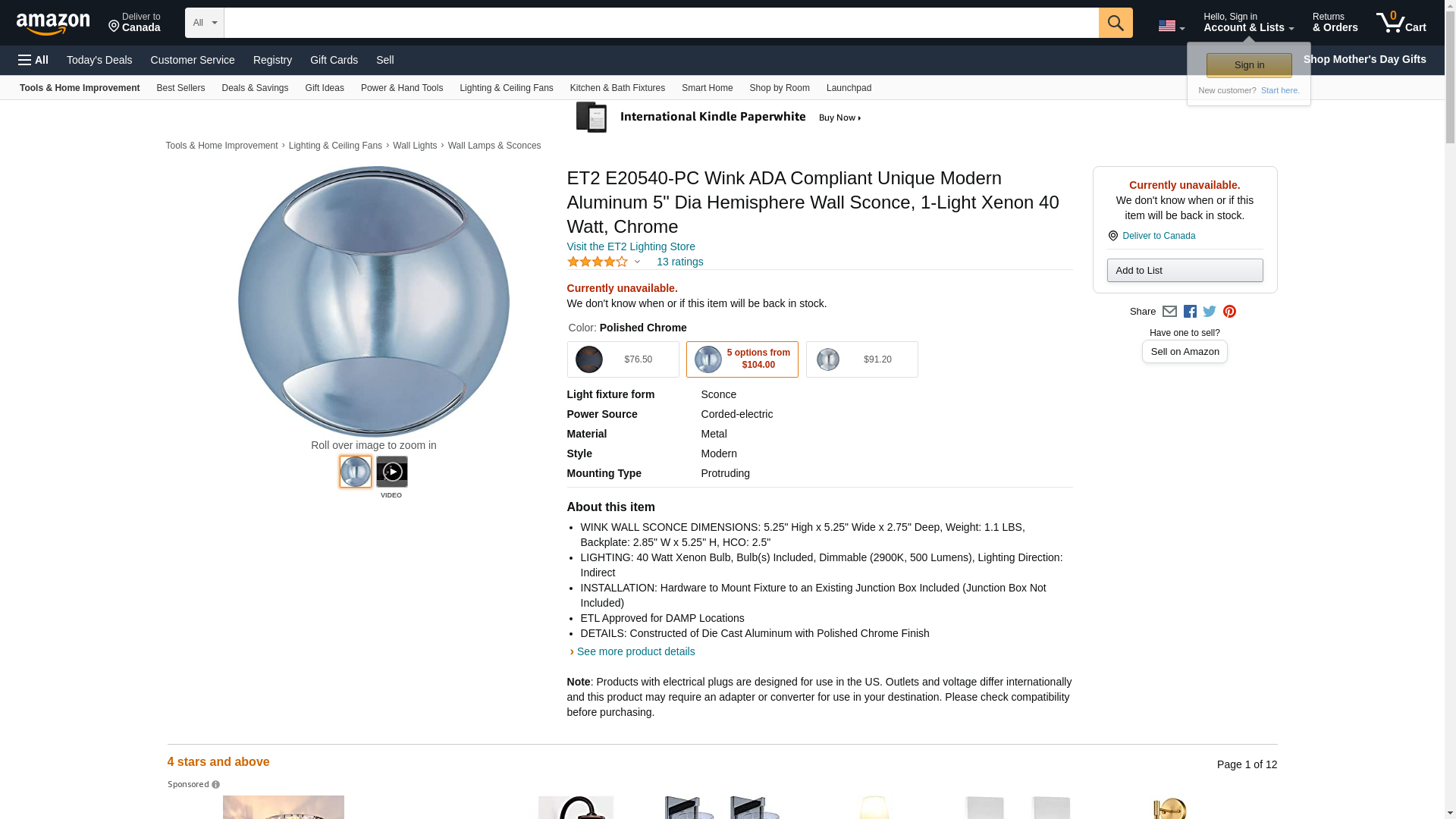 ET2 E20540-PC Wink ADA Compliant Unique Modern Aluminum 5" Dia Hemisphere Wall Sconce, 1-Light Xenon 40 Watt, Chrome