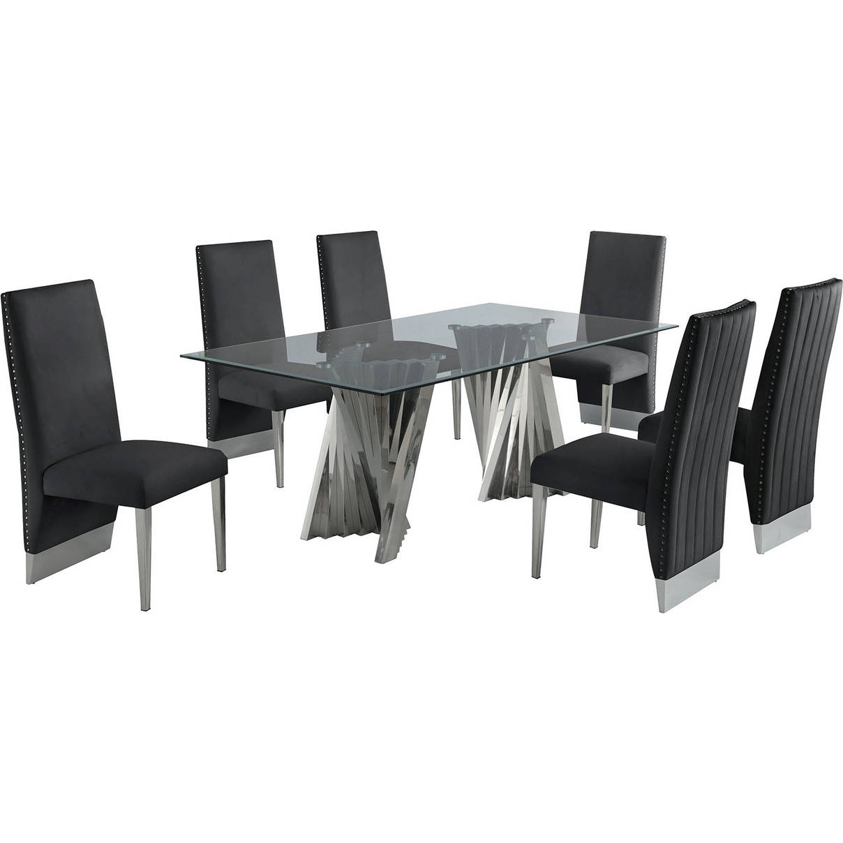 Best Quality D01-6SC166 D01 7 Piece Dining Set in Tempered Glass, Silver Chrome & Black Velvet