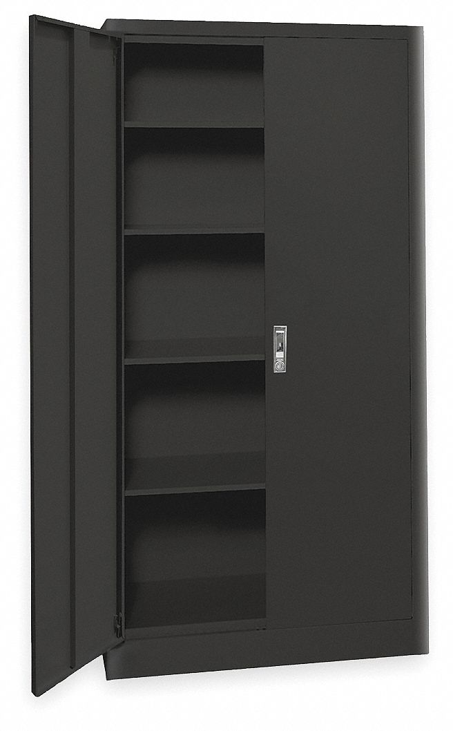 'Radius Edge Storage Cabinet, Door Type Solid, Cabinet Color Black, Assembled, Overall Height 72 In., Overall Width 36 In., Overall Depth 24 In., Material Welded Steel, Finish Powder Coat, Number of Shelves (3) Adjustable, (2) Fixed, 180 lb. Shelf Capacity, Locking System 1 Point, Recessed Push Button Handle'