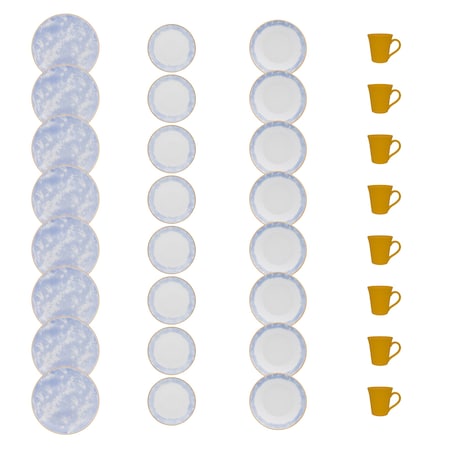 - Enjoy that Distinguished Look to Your Dining Place with the Coup 32 Piece Dinner Set by Manhattan Comfort, with a Complete Set for Four Made of Luxurious Porcelain in Beautiful Blue and Yellow Colors.
