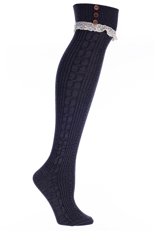 Minx NY VHT10568.GRY-L Cotton Knee Highs With 3 Buttons And Lace - Grey, OSFM