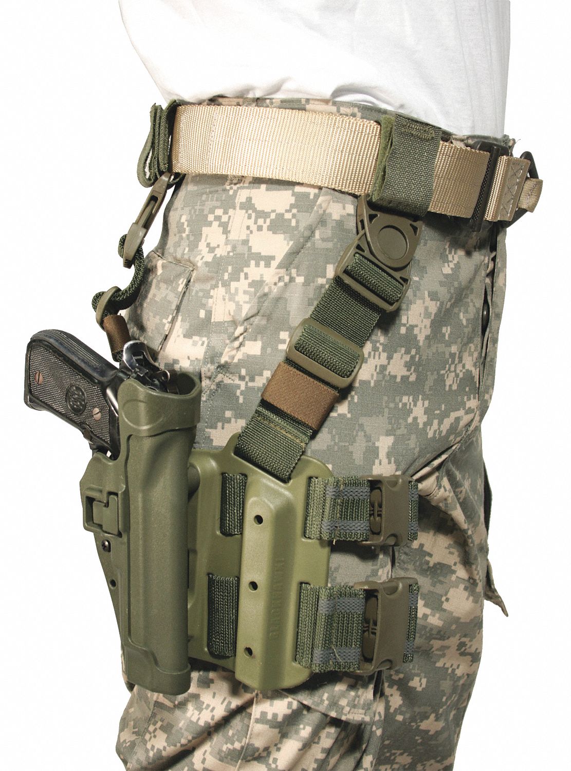 - Flexible thigh platform conforms to leg size and Y-harness suspension system distributes weight evenly, keeps holster vertical when kneeling, and allows use of pants pocket