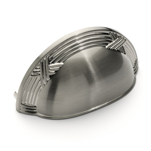 P-3455-SN Finish: Satin Nickel Features: -Material: Zinc alloy. -0.25 Thread mounting hardware. -Includes 1" long screw. -Super Saver collection. Style: -French. Primary Material: -Metal. Number of Items Included: -3. Fasteners Included: -Yes. Pull Type: -Cup/Bin pull. Dimensions: Overall Height - Top to Bottom: -1.75". Overall Width - Side to Side: -3.44". Overall Depth - Front to Back: -1.19". Overall Product Weight: -0.2 lbs.