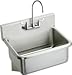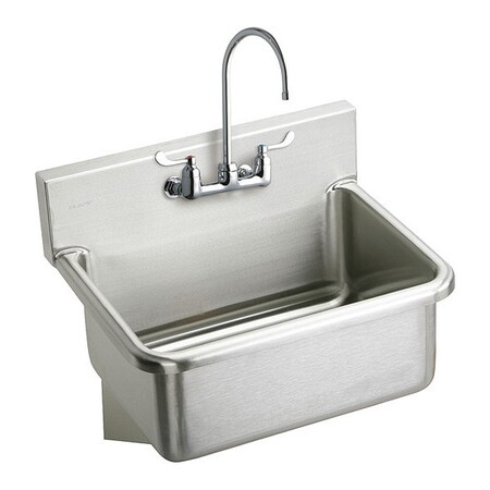 Elkay 31" Wall Mount 14 Gauge Stainless Steel Scrub Sink with 4" Wrist Blade Handles, Commercial Faucet and Drain Fitting Product Features: Wall mounted Stainless steel Scrub-up sink with 1-3/4" radius vertical and horizontal Coved corners 1-1/2" rolled rim Full length 6" high back-splash Exposed surfaces are hand blended Underside is sound deadened Furnished with wall hanger and Stainless steel support brackets Faucet: Two hole dual handle Wall mount faucet Quarter turn ceramic disc cartridge 1/2" adjustable inlets Solid brass construction Chrome finish Includes spout swing restriction pin 4" Wrist blade handles Product Specifications: Installation Type: Wall Material: Stainless Steel Number of Basins: 1 Sink Dimensions: 31" L x 19-1/2" W Bowl Depth: 10-1/2" Bowl Dimensions: 28" L x 16" W x 10-1/2" D Faucet Holes: 2 Drain Size: 3-1/2" Ship Wt: 42 lbs