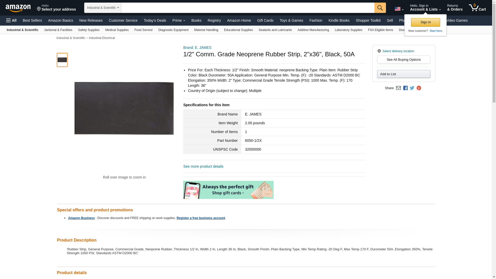 Toolschest.com|Toolschest.com. E. James 6050-1-2X 36 x 2 in. Neoprene Black Rubber Strip - 50A - 0.5 in. Thickness