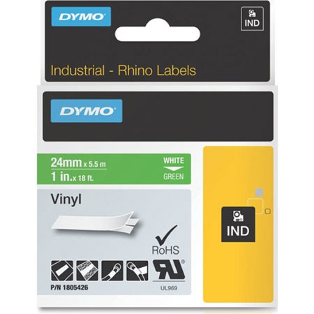 Dymo Label Tape, Vinyl, 1In W X 18Ft L, White On Green - 1805426