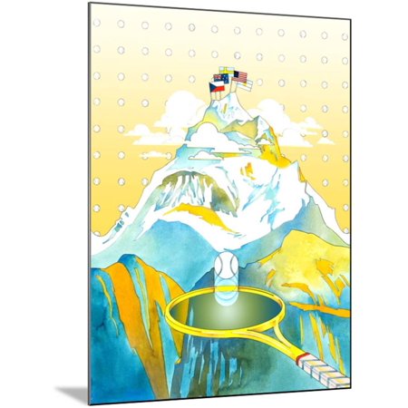 <ul> <li>Title: Snowcapped Mountain with National Flags and Tennis Racket with Ball</li> <li>Artist: David Chestnutt</li> <li>Product Type: Wood Mounted Art Print</li> <li>Provides a clean edge for a contemporary look</li> <li>Arrives ready-to-hang</li> <li>Built-in brace that lifts artwork off the wall for a floating effect</li> <li>Handcrafted in the USA</li> </ul>