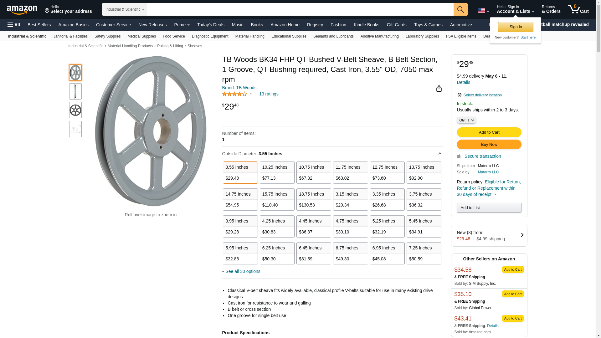 TB Woods BK34 FHP QT Bushed V-Belt Sheave, B Belt Section, 1 Groove, QT Bushing required, Cast Iron, 3.55" OD, 7050 max rpm