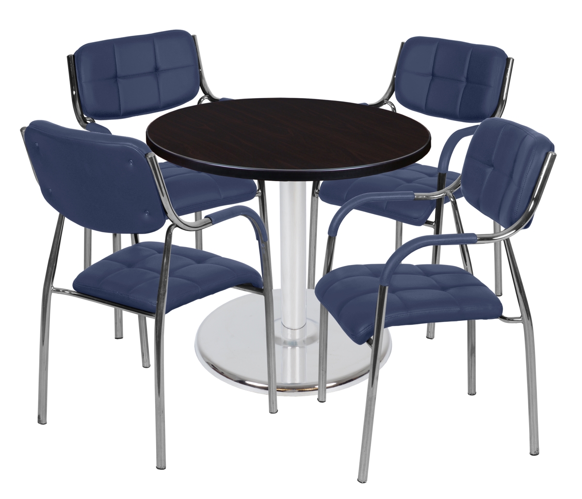 - Versatile table and chair Set includes one 30-inch round table with a platter style base and four Navy uptown side chairs