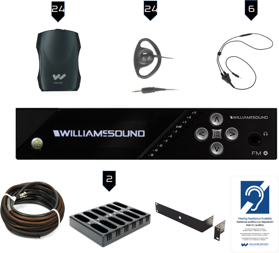WILLIAMS AV <b>FM 557</b> FM Plus Large-area Dual FM and Wi-Fi assistive listening system with 4 FM R37 receivers and FM T55 transmitter. The WILLIAMS AV <b>FM T55</b> Plus integrates professional WaveCAST Wi-Fi audio server technology into a Williams Sound FM assistive listening system. End users can now listen with either an FM receiver or with their own smartphone (via the WaveCAST Listening App). Along with this flexibility comes exceptional audio quality, as the FM Plus is built on a professional digital audio (DSP) platform. Added plus: Its optional Dante interface provides integrators with a full audio networking solution.</p><p>The FM Plus is designed to support those who want to use their own smartphones and headphones for a more discreet assistive listening experience. Simplicity is also available for those who want a more traditional assistive listening system with a dedicated FM receiver and headset. Venues no longer need to choose between providing FM or Wi-Fi assistive listening systems. FM Plus supports both the new iOS and Android WaveCAST Apps -- in addition to all of the current and legacy Williams Sound FM receivers operating on the 72-76 MHz bandwidth.</p><p>The FM Plus can have most settings changed via the front panel interface, or the hosted web interface. A remote programming guide is available upon request.</p><p>This version is not Dante compatible. For Dante compatibility, see the FM T55 D.</p><p>The FM Plus uses the WaveCAST app to provide an easy-to-use, intuitive user interface. It is available in iOS or Android. Listeners easily select channel and volume level once their personal device is connected to the Wi-Fi network. The app does not work on FM Broadcasts.</p><p><b>Note:</b> The FM + connects to the installation location's Wi-Fi Network. It does not provide a network on its own. The Wi-Fi network will need to be installed and established before the FM + can be used.</p>