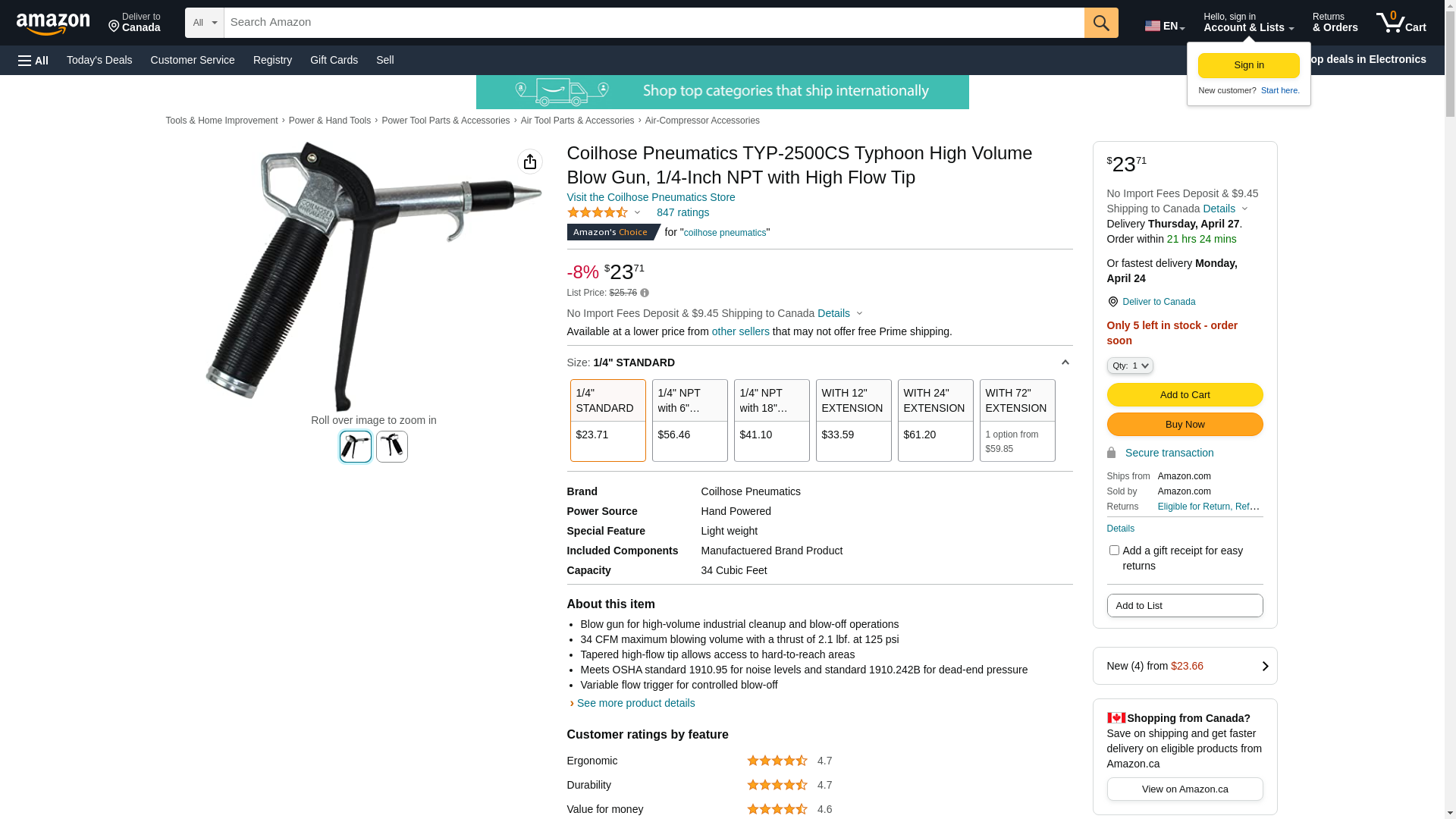 Coilhose Pneumatics TYP-2500CS Typhoon High Volume Blow Gun, 1/4-Inch NPT with High Flow Tip