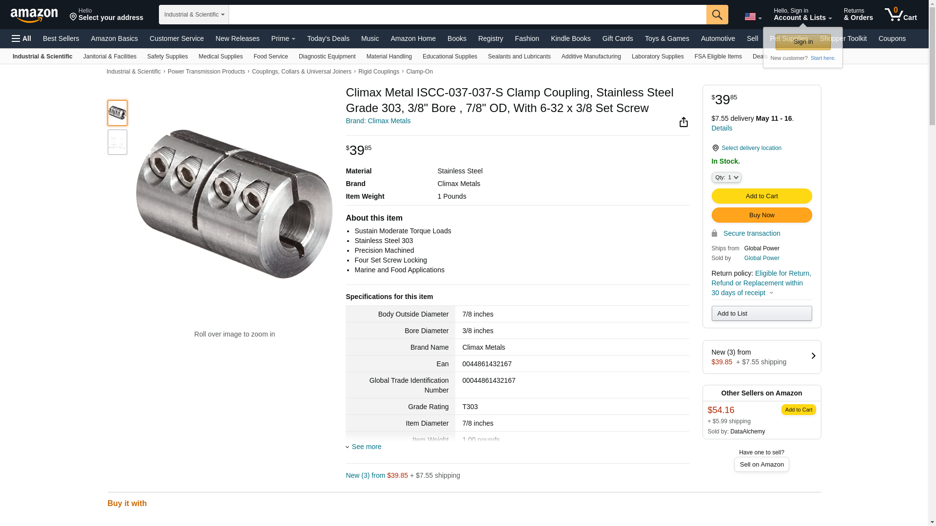 Climax Metal, ISCC-037-037-S, ISCC-Series 3/8" x 3/8" One Piece Clamp Coupling, Stainless Steel. Features: Stainless Steel One-Piece Industry Standard Clamping Coupling. High axial load and torque capacity. Does not mar the shaft.