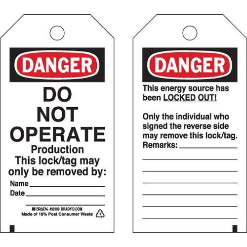 Brady 133552 DANGER Do Not Operate Lockout Tagout Tags - Heavy Duty Polyester 5.75x3 Black/Red/White, 25/pk
