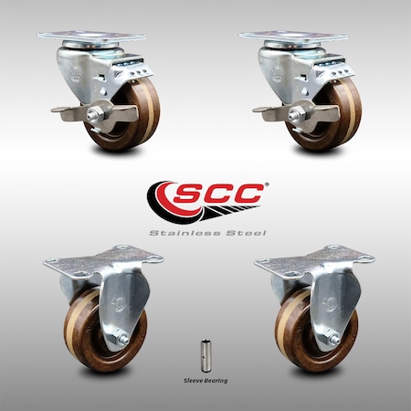 Stainless Steel High Temp Phenolic Swivel Top Plate Caster Set of 4 w/3" x 1.25" Brown Wheels-Includes 2 Swivel with Top Locking Brakes & 2 Rigid-1200 lbs Total Capacity-Service Caster Brand