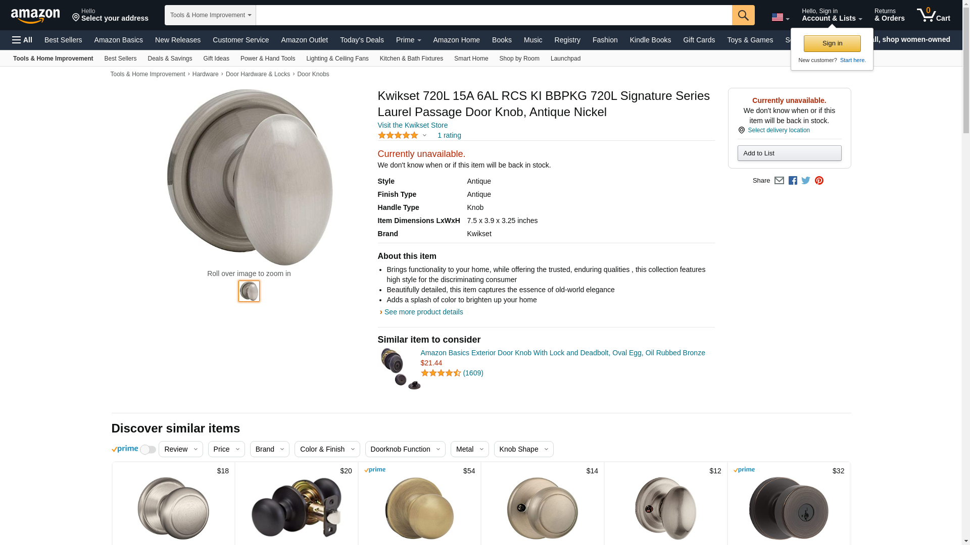 Kwikset 720L 15A 6AL RCS KI BBPKG 720L Signature Series Laurel Passage Door Knob, Antique Nickel