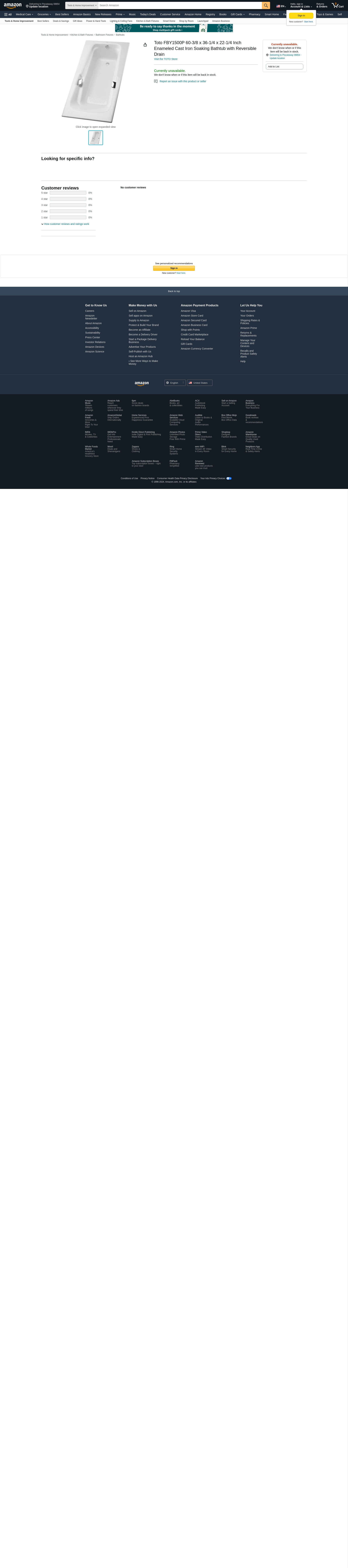 Toto FBY1500P 60-3/8 x 36-1/4 x 22-1/4 Inch Enameled Cast Iron Soaking Bathtub with Reversible Drain This elegantly simple bath offers a deep drop-in design. Slip-resistant surface makes it easy to get in and out. Enameled cast iron. Slip-Resistant Surface Cast Iron Construction Drop-In Style The Ultimate in Strength and Durability Product Features: Covered under Toto's 1-year limited warranty Tub constructed of enameled cast iron ensuring durability and dependability for years to come Soaking bath - Provides the user a soothing and relaxing experience Drop-in installation is capable of adapting to many different bathrooms A textured slip-resistant bottom takes the worry out of slipping and sliding as you move about the tub Equipped with an overflow assembly permitting the user to enjoy a deep soak without worrying about spillage Product Meet or Exceeds the Following Codes/Standards: ASME A112.19.1, CSA B45.2, IAPMO, cUPC, PC, NSPC, NPC Canada Available Finishes: Cotton: FBY1500P#01N Sedona Beige: FBY1500P#12N Specifications: Overall Height: 23-1/4 (measured from the top of tub rim to the bottom of tub) Overall Width: 31-1/2" (measured from back most to front most point on outer rim) Overall Length: 59-1/16" (measured from left most to right most point on outer rim) Basin Width: 26-3/8" (back to front measurement of the top of basin walls) Basin Length: 52-15/16" (right to left measurement of the top of basin walls) Water Depth: 19-11/16" (depth of water at tub's maximum capacity) Drain Location: Reversible SKU: FBY1500P#01N FBY1500P#12N FBY1500P01N FBY1500P12N"