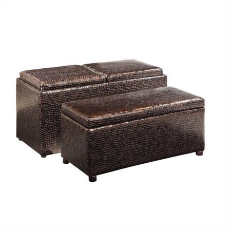 The Brown Croco BOGO Ottoman offers storage and functionality for any room in your home. The large ottoman has ample interior space for storing a multitude of items. The top flips, offering a cushioned side for seating and a tray side for storage/display. Nested inside, a smaller ottoman lifts out to offer additional storage space. The brown PVC croc upholstery adds bold appeal and eyecatching drama. Perfect for placing in an entry, hall, living space or at the foot of a bed. Material: Faux leather (vinyl); Offers ample interior storage space; Small ottoman nests inside the larger; Large ottoman top flips to reveal a cushion or a storage tray; Provides storage and functionality for any room.. Specifications:Big : 36" x 16.93" x 18.5" Small : 30" x 14" x 14"; Overall Product Dimensions: 18.5''H x 36''W x 16.93''D.