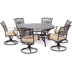 - Traditional Design: The Traditions Dining Collection by Hanover includes 6 stylish and comfortable cushioned cast aluminum swivel rocker chairs and a 60" round cast aluminum table