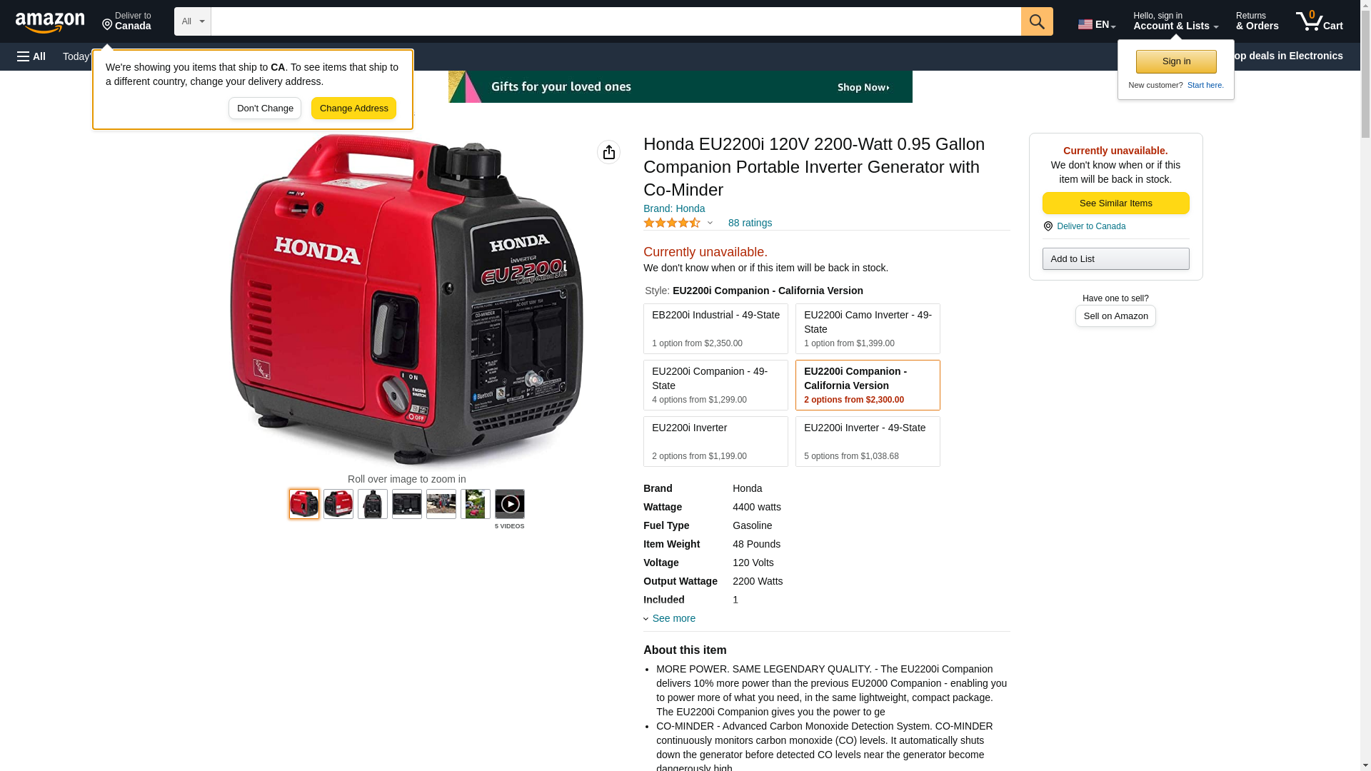 Honda 663530 EU2200i 120V 2200-Watt 0.95 Gallon Companion Portable Inverter Generator with Co-Minder