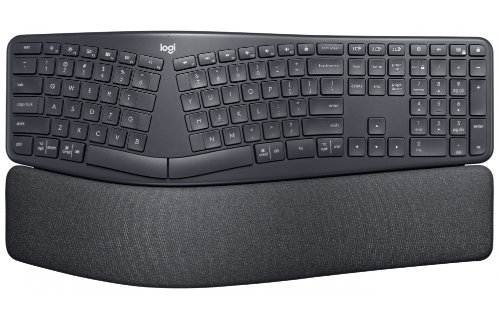 A FEEL-BETTER TYPING EXPERIENCE Introducing ERGO K860, a split ergonomic keyboard designed for better posture, less strain, and more support. You'll type more naturally with a curved, split keyframe that improves typing posture. The sloping form reduces muscle strain on your wrists and forearms - keeping your hands and shoulders relaxed. BETTER POSTURE, BETTER RESULTS ERGO K860's curved keyframe places your hands, wrists, fingers and forearms in a more natural posture - you'll notice the lack of strain the moment your hands land on the keyboard. ERGO K860 has even been proven to reduce muscle activity by 21% in the upper trapezius muscle-a key muscle in the center of the back that stabilizes and facilitates shoulder and neck movement. THREE LAYERS OF COMFORT AND SUPPORT A pillowed wrist rest places your forearms just above the keyboard, offering 54% more wrist support while reducing wrist bending by 25%. SURFACE LAYER: 0.5 mm of KNITTED FABRIC with a durable, stain-resistant, and easy-clean coating that's smooth to the touch. SUPPORT LAYER: 2 mm HIGH-DENSITY FOAM provides a comfortable, firm feel that equally disperses pressure. COMFORT LAYER: 4 mm of MEMORY FOAM offers a pleasing and personalized give, improving the feel of comfort and relaxation. GIVE YOUR WRISTS A LIFT Keep your wrists in a natural and comfortable posture, whether you're seated or standing with an innovative palm lift feature. Tilt legs of 0, -4, and -7 lift your palms into the optimal ergonomic position depending on your unique set up. EFFORTLESS PRECISION WITH PERFECT STROKE KEYS A fluid and ultra-precise typing experience with no compromise in speed and accuracy. Your fingers glide effortlessly across the matte surface of the keys, and tactile details make it easy to orient your fingers and stay focused. The split layout and convex curve promote a more natural hand and finger placement.