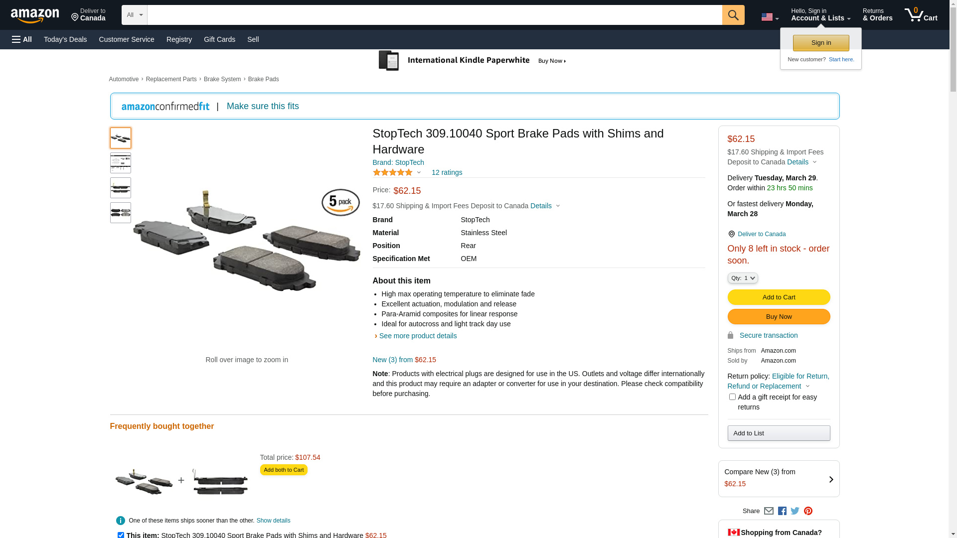 StopTech 309.10040 Sport Brake Pads with Shims and Hardware