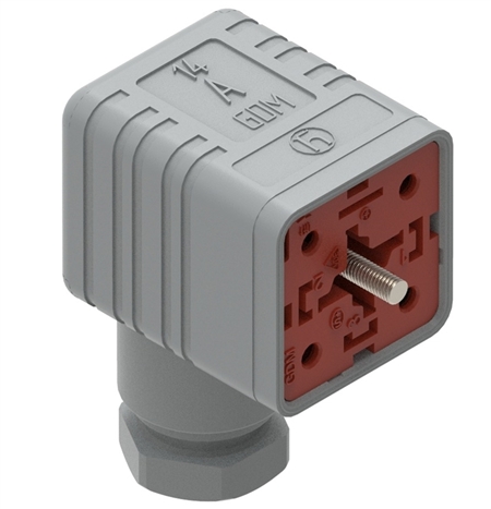 Hirschmann 932109-106 DIN 43650 Form A solenoid valve connector. 18 mm Pin Spacing, Hardwired. Accepts 6 mm to 9 mm cable. 3 + ground with no gasket.