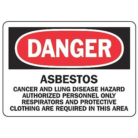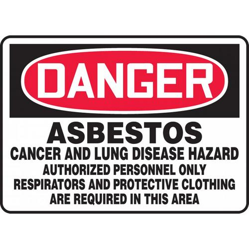7" x 10" Aluminum OSHA Sign with Legend: "Asbestos Cancer..." OSHA Sign with Legend: "Asbestos Cancer and Lung Disease Hazard Authorized personnel Only Respirators and Protective Clothing are Required". Warn anyone entering restricted work area to wear PPE to avoid exposure to health hazards. Clearly states the need for PPE to avoid being exposed to serious health hazards Affix in entrances to restricted work spaces where PPE is required Traditional OSHA-style signs, tags and labels are the most widely recognized design format in the industry Danger header indicates a hazardous situation that, if not avoided, will result in death or serious injury Aluminum (VA) Aluminum withstands wash downs, harsh elements, abusive conditions, and features good chemical, abrasion, and impact resistance. Aluminum is excellent for indoor and outdoor usage, making it ideal for a wide variety of industrial-strength applications. All Aluminum signs feature Accuform's TedLex liquid-based UV-protective coating, included at no charge. TedLex is perfect for indoor and outdoor use, prevents fading, and resists chemicals, abuse, and graffiti. Aluminum signs provide the strength of metal, yet never rust. Aluminum withstands wash downs, harsh elements, and abuse.