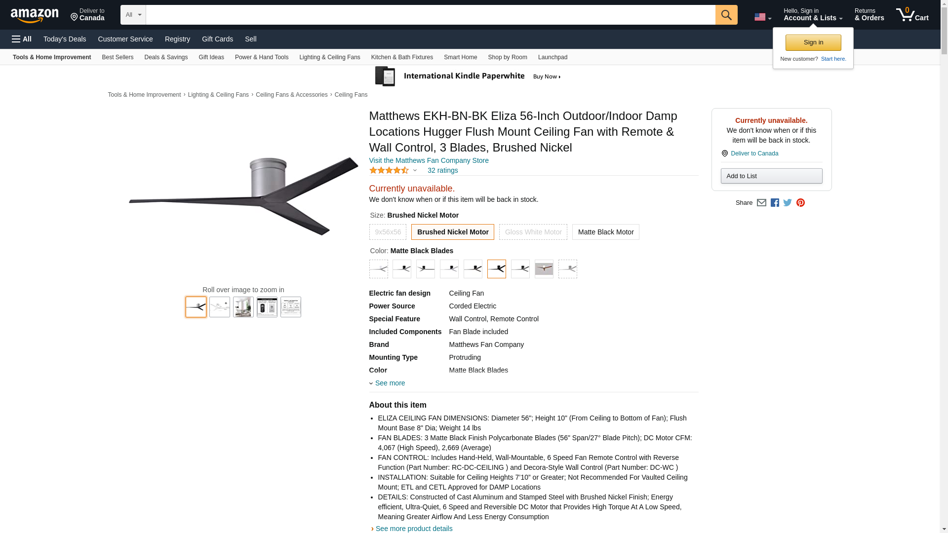 Buy Matthews Fan EKH-BN-BK 56-in 33W Eliza-H Ceiling Fan w/Remote, DC, 6-Speed, 3-Matte Black Blades, Brushed Nickel on HomElectrical.com. Take advantage of FREE SHIPPING.